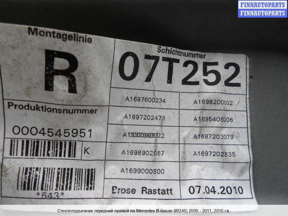 Компания FINNAUTOPARTS занимается продажей контрактных (б/у, бывших в употреблении) запчастей для иномарок. В нашей компании продаются только оригинальные запчасти из Европы, Японии и Кореи, которые не имеют пробега по РФ. Если вы хотите приобрести стеклоподъемник (передний правый) для а/м Мерседес Бенц Б (245 кузов), смело обращайтесь в нашу компанию. Все наши менеджеры — профессионалы своего дела, и с удовольствием помогут вам купить запчасти, в том числе, стеклоподъемники передние правые, на Mercedes-Benz B (W245) и другие автомобили.